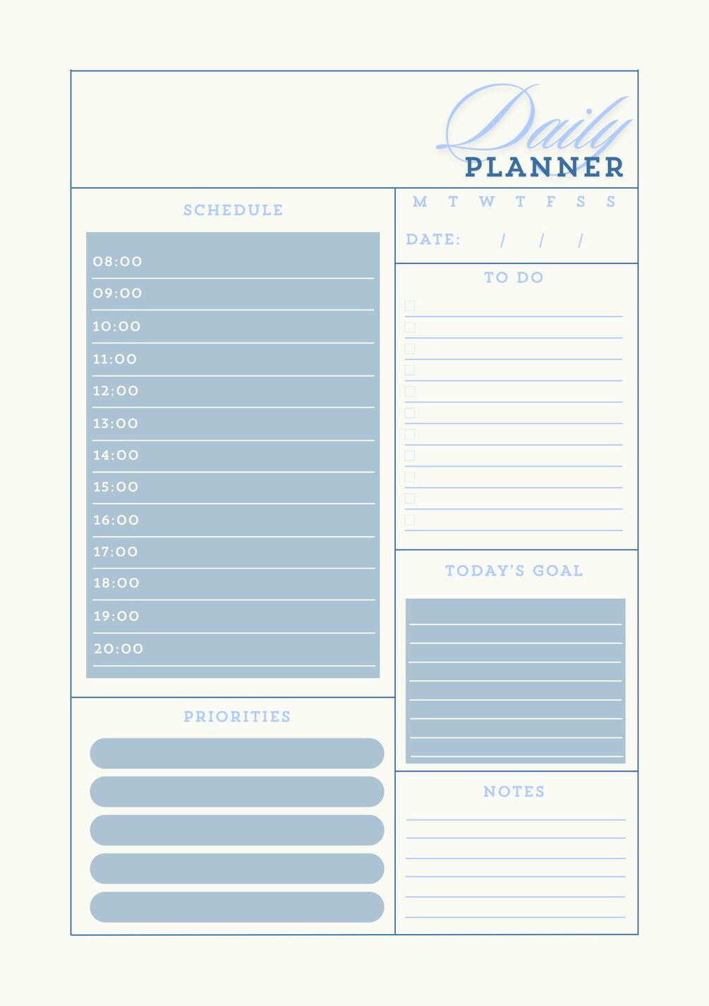Introducing the Ultimate Daily Planner, your perfect tool for organizing and boosting productivity! This thoughtfully designed template includes sections for hourly scheduling, to-do lists, top priorities, notes, and even daily gratitude or mood tracking. Ideal for professionals, students, or anyone looking to add structure to their day, this planner is fully customizable to fit your unique needs. Start each day with clarity and achieve your goals effortlessly with the Ultimate Daily Planner!